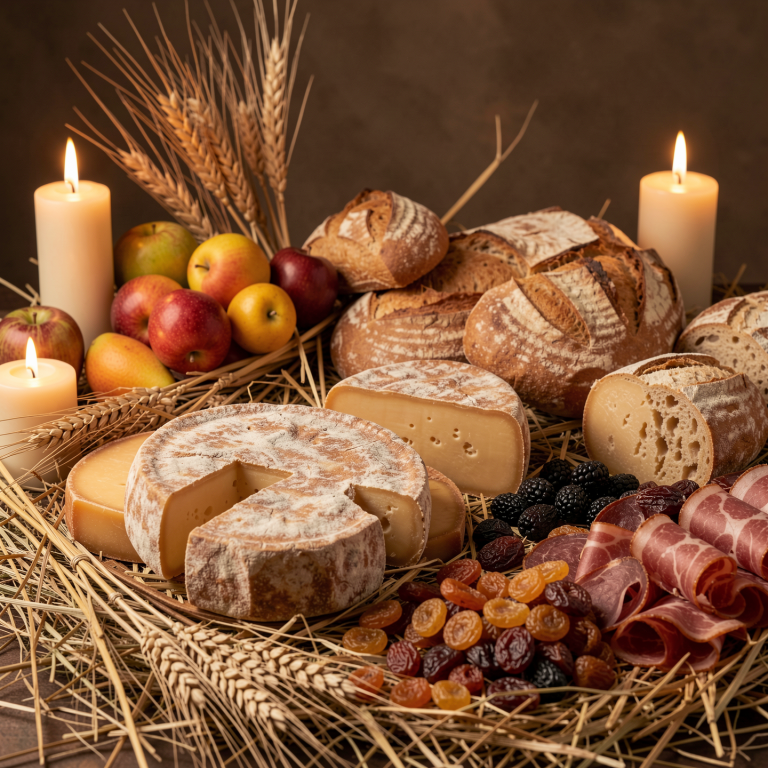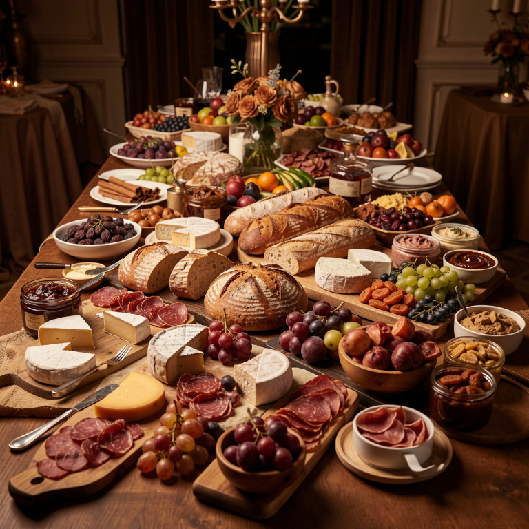 Fromages affinés, charcuteries de qualité, pains artisanaux, fruits frais, secs et confits, tartinades savoureuses, confitures et variation de condiments.