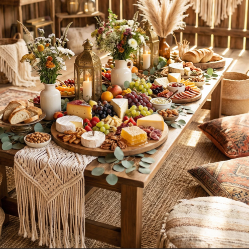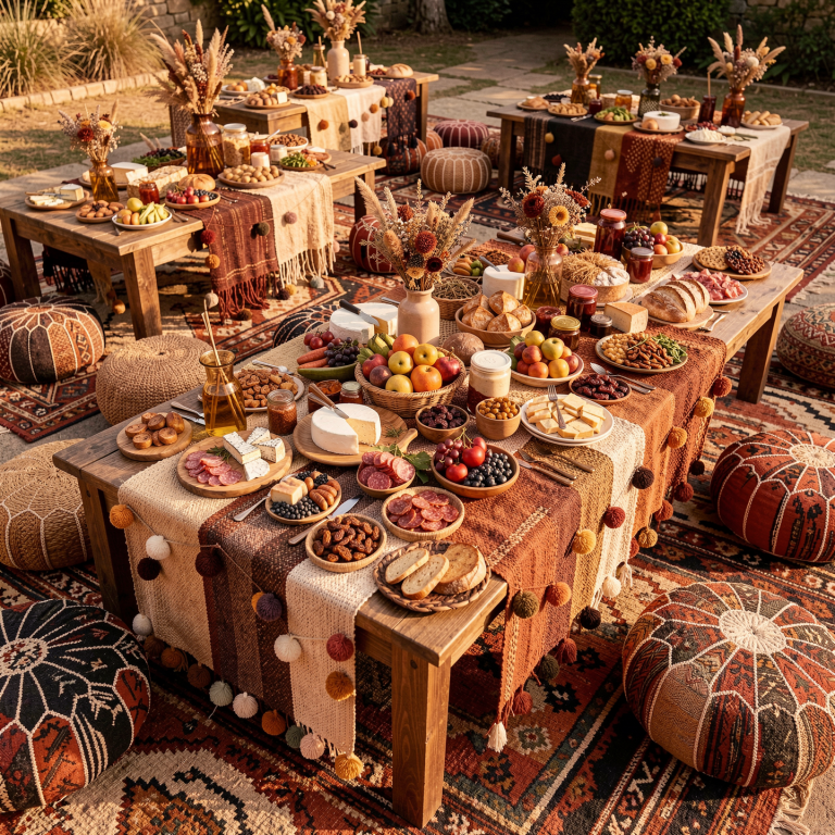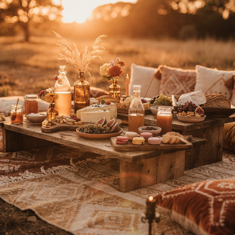 Le cachet d'un pique-nique chic où les tapis berbères, les coussins et les matières textiles créent une scénographie forte et très instagrammable.