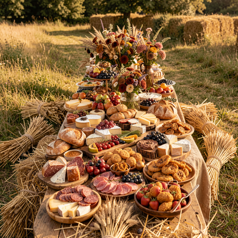 Le caractère des grandes tablées de campagne, où le bois, la paille et les matières naturelles créent une ambiance chaleureuse et conviviale.