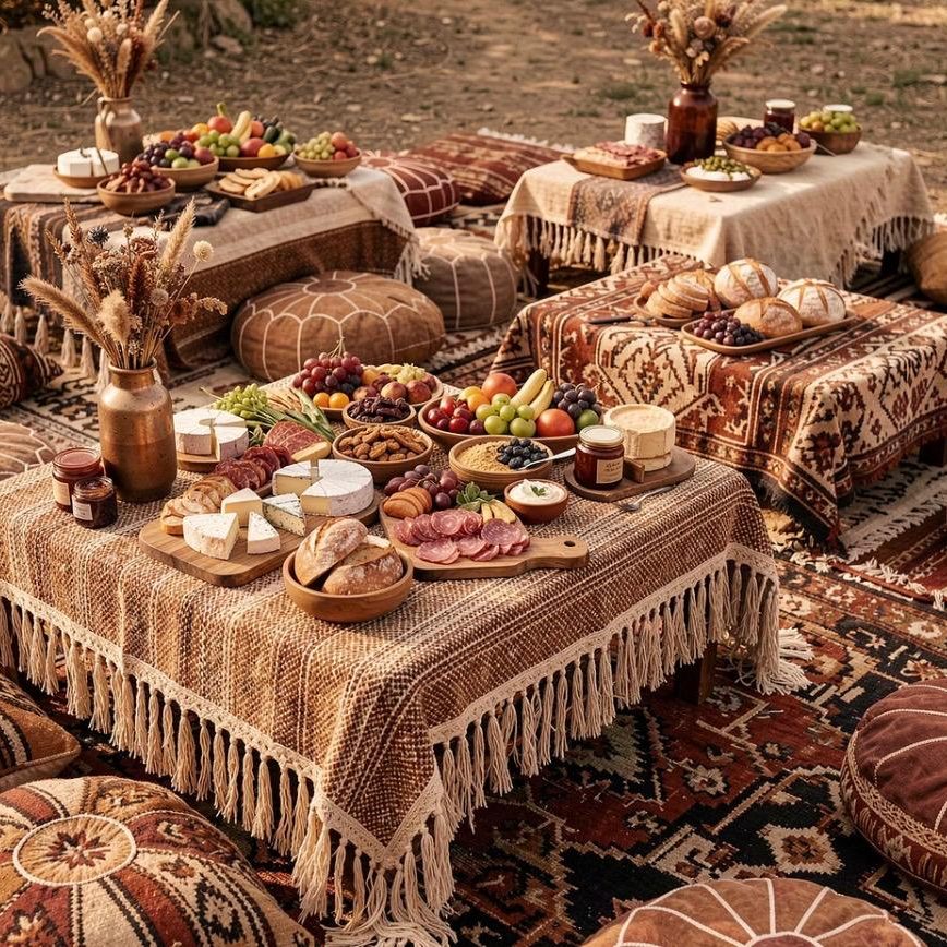 Le cachet d'un pique-nique chic où les tapis berbères, les coussins et les matières textiles créent une scénographie forte et très instagrammable.