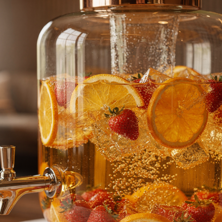 Pour sublimer votre table gourmande, nous proposons la création de cocktails sans alcool et de jus pressés, infusés de fruits frais et présentés avec élégance dans de délicates bonbonnes.